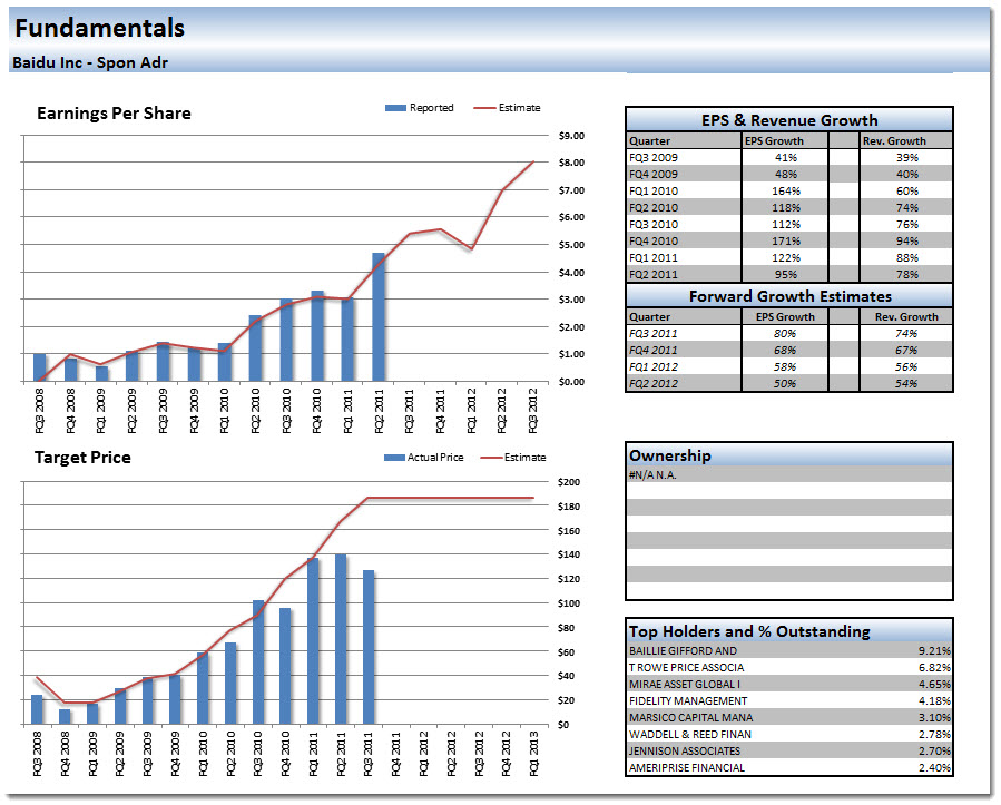 STOCK PERFORMANCE (%) 3 Mo. 1 Yr. 3 Yr (Ann) Price Change 6.10 30.45 40.00 BIDU BAIDU INC 57,244 34.94 8,430.83 2,112.66207.55 This report is for information purposes only and should not be considered a solicitation to buy or sell any security. ... Get Content Here