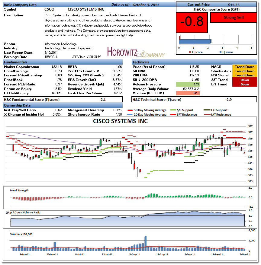 POSITIVE OUTLOOK: CSCO's current score of 9 places it within the top 15% of stocks scored. The Thomson Reuters Stock Report is a comprehensive, company-specific analysis that includes a proprietary Stock Rating along with underlying component indicators and supportive data elements. ... Doc Retrieval